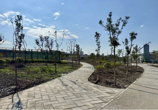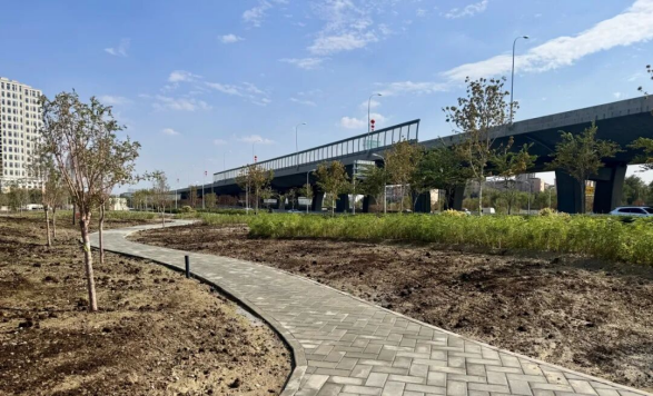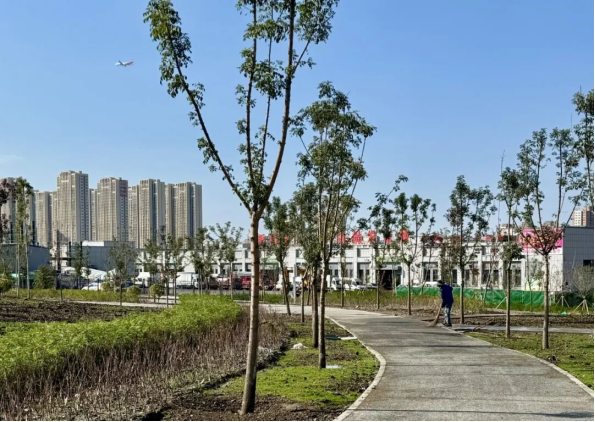 目前工程已完成土方换填、场地铺装和公共服务建筑主体结构,累计栽植乔木4000余株、灌木20余万株,铺设草皮超过10万平方米。现阶段正全面推进喷淋系统、中水管道、照明、休息座凳等附属设施安装与精细化施工。