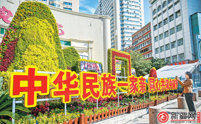 在乌鲁木齐西站的花堆造型处,彩色的“70”与一旁“扎根边疆奋勇争光”的几个大字相呼应。