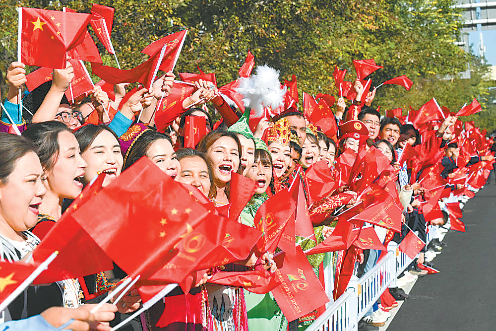 9月25日中午,习近平总书记在乌鲁木齐出席新疆维吾尔自治区成立70周年庆祝活动后,乘专机返回北京。在乌鲁木齐市区和机场,新疆各族群众热情欢送习近平总书记。 (据新华社)