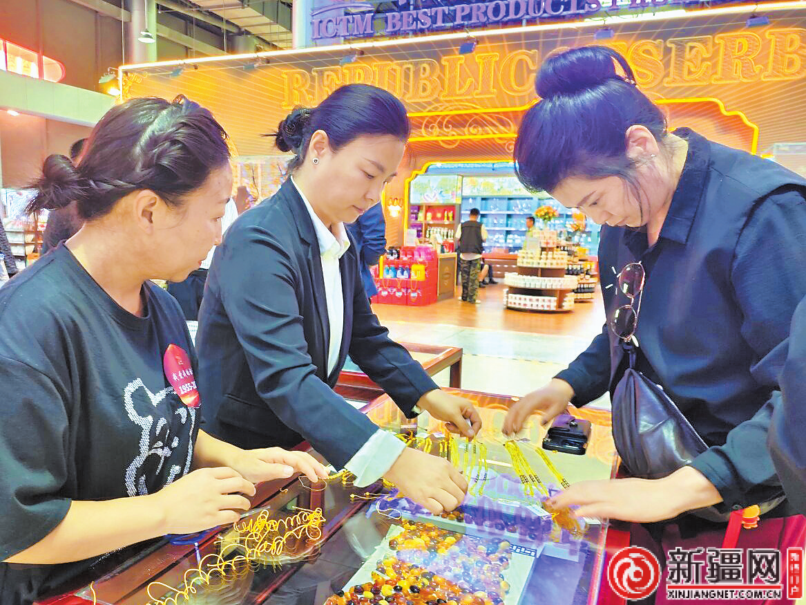 9月28日,在乌鲁木齐综合保税区的保税展示交易中心,市民在首届国际琥珀蜜蜡玉石博览会上选购商品。(记者唐红梅摄)